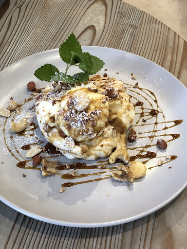 ハーフサイズパンケーキはキャラメルナッツを選びました。 ふわふわパンケーキにバニラアイスだけでも充分なところ、ナッツも(アーモンドダイスとかの小さいサイズではなく)ゴロゴロ入っていてとても満足感が高い逸品です。