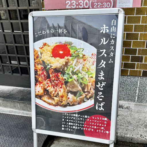 Read more元々はホルモン焼肉店で間借り店舗のようです。基本のホルスタまぜそば小150g1,200円にしました。まぜそば自体はかなり完成度が高く、監修店の特徴もあるハイブリッドな味わいです。開店前からオーダー取りを行っているのに案内が遅く、不手際と思いましたが、2Fの座敷席メインというこの店の構造では、致し方ないようです。ただ、行列しているのは客数ではなく、このオペレーションが原因でしょう。入り待ちの時に、ベンチや傘・水分補給を配慮してくれていますが、路側帯を占拠していて、喫煙スペースまで設置しているのは大きなマイナス点ですね。喫煙スペースは、愛煙家にとってはメリットですが、待ち客や近隣には只々迷惑です。店内衛生面は清掃清拭が不充分で×、値段面では単価的には高いですが、モノ相応に感じます。接遇面では店主さん店員さんたちみなが丁寧で愛想よく好印象ですが、上述のマイナス店があります。また、一巡目でも着丼までの時間が少しかかりますね。まぜそば自体は美味しいのですが、トータル評価...