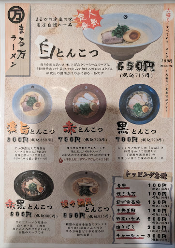 Read moreまる万ラーメン大谷店さんに土曜のお昼に伺いました 駐車場は敷地内なら歩道に出ていなければどこでも良さそう テーブルが4つ程とカウンター席あり、案内・オーダー取られる女性店員さんの対応も良かったです 濃い目のとんこつを食べたい気分だったので「濃旨(こいうま)とんこつ」とチャーハンを注文 ラーメンは細麺でもう少し濃いめでも自分は良かったですが、洗練された感じの豚骨スープに背油がいい感じに絡まり、クリーミーで深みも出ていてとても美味しく最後まで飲んでしまいました チャーシューもスープでとろける感じの良い薄さ、煮卵も硬すぎずスープに溶け出さない丁度良い硬さの黄身加減 チャーハンはラー油で少しピリ辛、美味しいですが何の焦げかわかりませんがあり、歯ざわりが良くなく惜しい感じでした 後から来たお客さんに赤とんこつの辛さを聞かれ説明されていましたが、非常にわかりやすい説明で聞いていて微笑ましい感じになりました 人気の定番は「白とんこつ」らしいですが、他に「赤とんこつ」「黒とんこつ」「赤黒とんこつ」「担々麺風とんこつ」があり全部食べてみたいと思いました あとこの店限定の「大谷店限定セット」も食べてみたいですね 味・接客など全体...
