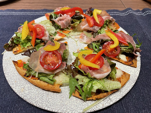 今回はじめてピザを頼みましたが、生地はかなり薄くてサクサクで野菜が沢山乗せられていました。これは嬉しい誤算。イメージではチーズがしっかりのっているものでしたが、料理の途中でも最後まで頂けるヘルシーなもので見た目も綺麗。