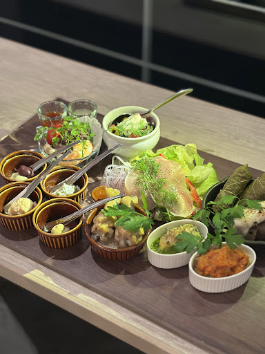 グラスフュリ・ド・メーマリネ 生ハムとギリシャ産オリーブフェアチーズのサラダ(グリーク風サラダ) ドルマデス ムサカ ナヴアラン・ダニョー 粒貝エスカルゴ風 コトスパレモニシコールド フムス メリジャーノサラダ ジャジギソース たらもサラダ