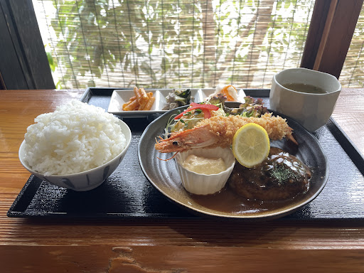 有頭エビフライとハンバーグのセットですが 大きな有頭エビフライもとても美味しく タルタルソースは別皿小鉢に入れられていましたがタップリの量が入ってました ハンバーグも絶品で、もずくスープも少しショウガがきいて美味しかったです 1つ言うなれば… スープはさめていて残念でした 3品入った副菜もとても美味しく頂きました