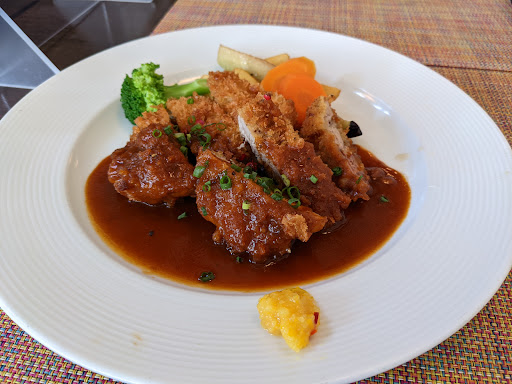 ランチのポークカツレツ(ヘレ)と シーフードプレート注文しました ライスかパン選べるみたいです ライスサイズは女性向け?! 大盛り注文で普通ちょい増しくらいですか? お皿もカワイイですからオッサンは 大盛り一択ですw スープは冷製サツマイモのポタージュ! いきなりやられました!ウマウマ!! メインもカツ、魚、かなり本格的で たいへん美味しかったです!!