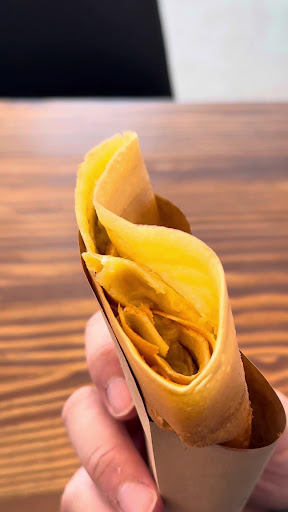 【2024年12月移転後】 ハローワークの近くにあります。専用駐車場はなさそうですが、近隣にコインパーキングがあるので利用するとよさそう。 移転前の店舗はこじんまりとした感じでしたが、今回の移転先は割と広い感じです。 入ってレジのところで注文する方式です。焼き芋シュガーバタークレープとほうじ茶のホットを注文。支払いはPayPayなどのキャッシュレス決済が可能です。 ほうじ茶のホットは割とすぐに提供されました。かなり熱々でした。 焼き芋シュガーバタークレープは注文してから焼き始めてくださって、3分ほどで提供されました。こちらもなかなか熱々でした。バターの塩気が焼き芋の甘さを引き立てていて美味しかったです。