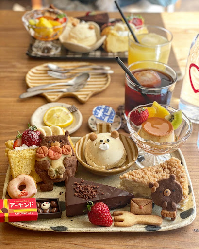 ・林檎のクランブルチーズケーキ ・生チョコタルト ・プリン ・ミニ焼きドーナツ ・シフォンサンド ・バナナのアイス ・フォークのクッキー ・ドリンク