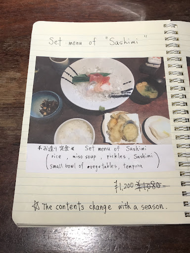 Read moreA fish restaurant in which I have my best lunch so far in this Japan trip. Many local Japanese people would go. Very fresh sashimi, tasty tempura, high quality rice, soup & side dishes also yummy~ (picture is sashimi set and tempura set) 4 standard lunch sets Sashimi, stew, grilled or tempura, and special set with stew and sashimi. There is another special meal with sea bream but not available today. Car park...