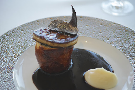 ○前菜/Entrée de jour オマール海老のブーダン(腸詰) オマール海老と鯛のすり身を豚の腸に詰めて調理し、腸を取り外したブーダンに甲殻類のソースと海老から取ったオイルを添えてあり、濃厚な海老の旨味が素晴らしい美味しさ♪♪♪♪