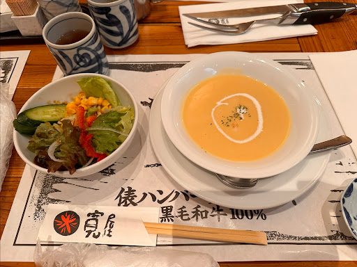 Read more初来店で火曜日12時過ぎ到着、入口でランチは売切れと知らされたが了解し、席へ通していただく。2人で入店、窓側の4人席に案内された。窓を背に座ろうとしたら、通路側の窓に向く席へ案内された。店側都合と思い従う。黒毛和牛俵ハンバーグランチコースを2人とも注文。←こちらのハンバーグは150gか?総合的にいってこちらを注文して良かった!ランチが売切れてなかったら絶対ランチを選んでたと思うと、売切れてくれてよかった。ランチのハンバーグは100g+フライらしい。次回は200gを選び、スープが付かない基本に近いハンバーグを選んでみたい。 ランチコースでは、先にコーンスープとサラダが到着、スープを飲み終えないと、ハンバーグは持って来てくれない感じ。ハンバーグの鉄板が大きいからスープ皿と同時にテーブルに置けないですし、ハンバーグの油がかなり飛びますから。スタッフさんはハンバーグを運ぶタイミングを見てくれているようです。お肉...