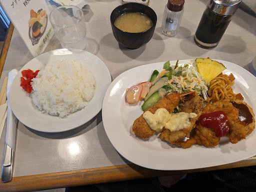 Very Showa/retro cafe with an extensive menu. I had the mix fry lunch set that came with some salad, a fried prawn, a fried pork cutlet, a cream croquet and a piece of fried fish. It also came with rice and miso soup. It costs 1400 yen. The cafe has a cool atmosphere and I would definitely come...