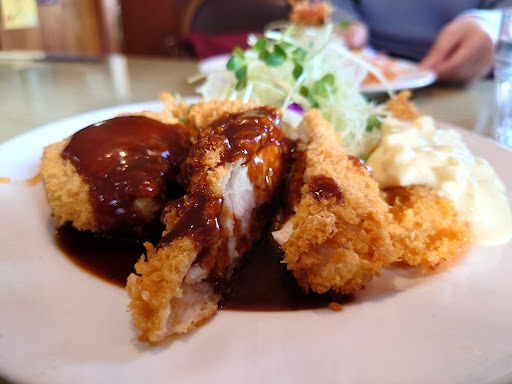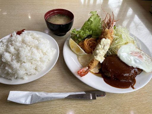 Read moreエビ・ハンバーグ定食を頂きました。有頭エビのフライはお皿からはみ出るぐらい大きく。ハンバーグも噛みごたえがあり美味しかったです。全体的には、濃厚な見た目とは違って、意外とあっさり頂けた印象。喫茶店のハンバーグ&エビフライとすれば、十分な美味しさ。ただ、1,400円という値段を考え合わせれば、こんなものかなぁって思った。お店の雰囲気も、昭和感を感じるノスタルジックなもので心地良い。常連さんが多いのは、それだけいい店ということなんだと思うけど、初めて行く者としては若干マイナスかも。ただ、少しふくよかな外見の女性店員さんの接客がとても良く、アウェー感なく迎え入れてもらうことができた。幹線道路から少し競技場側に入ったところにあり、つい見落としてしまいがちですが、一度ぐらいは行...