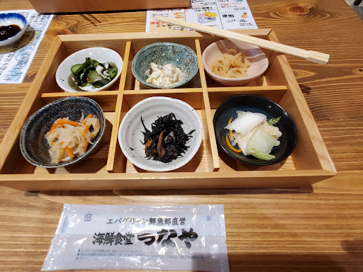 Reasonably priced fish restaurant (bar menu at night) operated by Evergreen supermarket. We went at 1pm and it was very busy and they stopped serving lunch at 130pm because they were sold out. My wife had the つなや set (the fish is a fish head not a whole fish) and I had the sashimi set. You get a big plate of sashimi, rice, miso soup and a set of 6 small side dishes. My sashimi set was 1320 yen (incl tax) so I think it's pretty good value. I would come here again for lunch and I would like to try the evening...