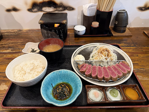 Read more2名で行きました。11:30オープンなので、11:00から、玄関横にベンチがあったので、オープンするまで待ちました。11:10くらいには2名のお客が更にまち、オープン5分前には、僕を含め、6組くらいは、待っていたように思います。早く到着して良かったと思いました。11:31にオープン。微妙に開店せず(苦笑い)若いスタッフ2名でやっていたように思います。テーブル2名×2席カウンター4名の小さなお店です。なので、5組入ったら、満席ですので、もし、1組が2名でしたら、5組目は入れないので、更に待たないといけないことを肝に銘じておいてください。トップバッターだったので、注文してから、提供までは10分もかからないくらいで、出てきました。『牛カツ定食200gを注文』かなりレアな状態で出てきます。火の通し加減は固形燃料の入った鉄板?を用意してくれるので、それで、お肉をお好みで焼きます。薬味は藻塩?わさび 特製醤油をお好みでつけて食べます。藻塩?が個人的には好みです。お肉は弾力があるけど噛み切れる感じで、美味しいく旨味もあります。カツの衣が薄過ぎるのが良いのか悪いのかは分かりませんが個人的には、サクッと音が鳴るような、インパクトがあったらなーと感じました。他、お味噌汁、とろろ、麦ご飯がついて、黄身と刻みのりの入った甘辛い醤油ベースのものもついています。麦ご飯にとろろと黄身の入ったものを入れて食べたら美味しいでしょうけど、僕は一品ずついただきました。ごちそうさまでした。 『役に立った』をポチッとしてくださったかた。ありがとうございます^...