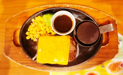 ・加えて、ビーフハンバーグステーキ チェダーチーズ。 ・普通のハンバーグとの違いは何だろう?と思ってメニューに目をやると、「こだわりビーフ100%使用」のハンバーグだそうです。 ・しかも、加熱用ペレットという熱々鉄板小皿の上でさらに火を通して頂く商品になっているようですね。