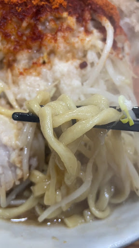 24.1.28再訪 ラーメン並少なめ、ヤサイ少なめ、チョイ辛別皿 全体的に満足感のあったこちらへ再訪。14:00店内待ち無しに到着。 相変わらずすごい熱気でメガネ真っ白…並を購入、空いてる席へ。 並びがないときは何も聞かれないようであやうく減麺しそこねるとこでした。あとからあわてて少なめをオーダー。 しばらくして「○番の方〜」との声掛け、前回多く感じたヤサイは少なめとチョイ辛別皿をコール。 すぐに着丼、いざ実食! スープ。やっぱ旨い! 麺。極太平ウェーブ、いい歯ごたえでやっぱいい! ブタ。ほぐれ感と味の濃さ、やっぱいい! チョイ辛は魚粉で旨味が増す感じと辛みがいいアクセントで旨い。結構辛いのとノーマルで美味しいので無くてもいいかな。魚粉トッピングがあってもいいかも。 2回目も大満足。つけ麺、まぜそばも食べてみよう! 御馳走様でした。