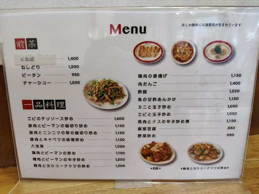 卓上の調味料がとても清潔で気持ち良いです. 店名はちょっとお堅いイメージですが普段使いできる中華料理店,メニューに野菜炒めはありますがニラレバ炒めがありませんのでご注意下さい.餃子はニラ入りで風味豊か,チャーハンを注文すると鍋を煽るカンカンする音がともかく心地よいです.なおチャーハンはしっとり系で食べ応えがあります. 昼にはラーメンとミニチャーハンのセットが用意しているようです.