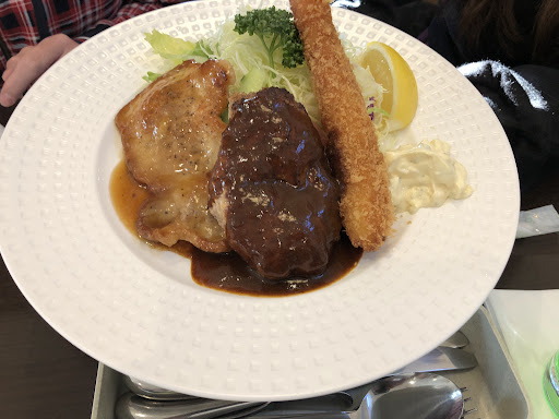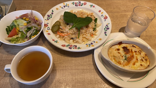 Read more遅い時間のランチ。ググって初めて伺った。 ランチタイムが他より1時間長い(でもラストオーダーはランチタイム終了1時間前だった)のでありがたい。 Aランチとペイザンピラフをいただく。 Aランチはエビフライ、ハンバーグ、ポークジンジャーの中から1品選ぶのかと思いきや、全部ついてきてびっくりした。 でもどれもおいしい。それぞれで食べても、それぞれの味が混ざり合ってもおいしかった。 私は後半、お行儀が悪いとわかっていながらライスをこのいろんな味が混ざったプレートに乗せて食べた。おいしい。