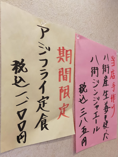 昼に入りました。 寿司割烹みたいです。内装は和風で、落ち着いた雰囲気でした。 席はカウンターは4で、見える範囲にテーブルが4。座敷や宴会場が有る様で、法事などが主体の店っぽいです。 頼んだのは《唐揚げセット》1210円。《自家製八街ジンジャーエール》440円。1650円です。クレカは3300円以上から使えるらしいです。 八街らしいメニューは有りませんでした。刺身や鰻が好評の様ですが、八街で海鮮は気乗りしないし、鰻も気分ではなくて見送り。無難に唐揚げにしました。 ジンジャーエールは中々に生姜が効いています。辛口と言う程ではないですが、甘味も程良くて美味しかったです。 唐揚げはややシットリした食感で、衣は厚め。味は程良く、肉汁が有りました。セットだからか、3個しかないのは残念です。 うどんはコシが有りました。汁は関東風。けっこう濃い味で、私には醤油が強いと思いました。 サラダは鮮度が良くドレッシングが美味しかったのですが、キャベツとサニーレタスとクルトンだけだったのは、彩りも味も単調に成りがちで残念。トマトや胡瓜が有ればと思います。 白飯が美味しかったです。硬さが程良く、盛り付けも空気を含ませる様にフンワリと盛った感じがします。炊き方か米の質かは分かりませんが、良い白飯でした。 食後にコーヒーが付きました。アイスのみでした。多分、パックで売っている物でしょう。味は普通でした。 うどんが付くからでしょうか。白飯も唐揚げも少なめでした。定食にしたら良かったのかもしれません。ランチメニューも見本の写真が有れば良かったです。 八街は美味しい野菜が多いですから、地物の野菜を使った料理が有れば良いのにと思いました。 接客は丁寧で良かったです...