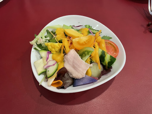 ■ランチサラダ 20〜30種の野菜が入り、人参のドレッシング。 トマトのみ説明があり、アメーラトマト。