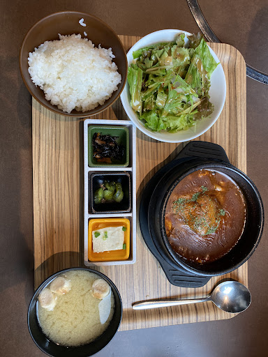 人気定番ランチ煮込みハンバーグランチ¥1100注文。 精肉店が隣にあるで直営店のお店ならではハンバーグは肉肉しく美味しい。 しかしソースは値段以上の味はなく、具は肉以外卵としめじのみ。可もなく不可も無い味。 値段以上の味は出てなく、ポテトサラダも量が少なく、ランチは全てお肉の材料費に全振りしたのかな?とぐらいお肉以外はこんなもんかーという印象。 ご飯は無料でおかわり自由。 お味噌汁は卵でワカメとお麩は自由追加出来ます。味はしょっぱかった(^_^;)