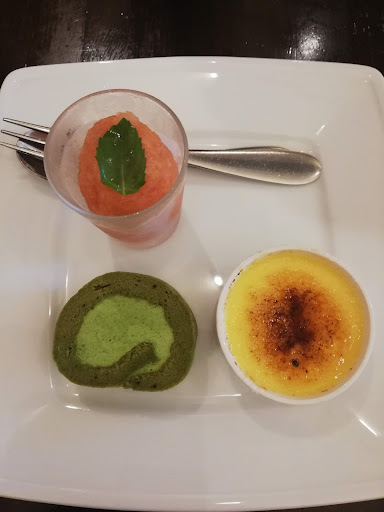 Bランチを選びピザを選びました。 前菜盛り合わせは一口サイズ、ポテトサラダサーモン添え、ラタトゥイユ、ミニスープ、ミニキィッシュ他どれも美味しく目でも楽しめる一皿です。 メインのピザ🍕はモチツァレラ、塩豚、ネギをチョイス、モチモチした生地に具もあいまって美味しいです。途中オリーブオイルを描けてもよいかなと思います。 スイーツ盛合せ、シャーベットがさっぱりしていてさっぱりさせてくれます。抹茶のロールケーキはしっとりしていて美味。クリームブリュレも甘さ控えめでトロトロでコーヒーと合います