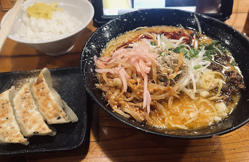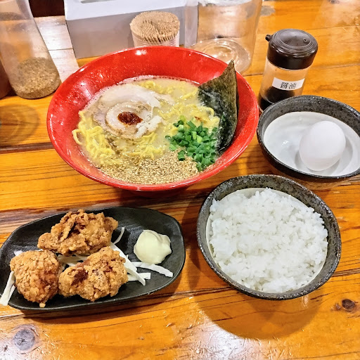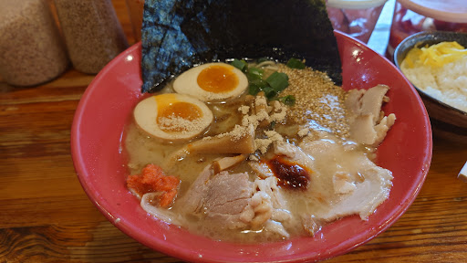 Read more東葉高速鉄道の八千代中央駅から徒歩10分くらい、車だと八千代市市民会館と八千代警察署に挟まれた新川大橋通り沿いにあり、駐車場も広いく、表の通り側からと店裏の警察署側からも駐車場に入れる。 店内はカラフルでVの字カウンター席が厨房を取り囲むようにあり、その周りにテーブル席が配置されている。また、駄菓子も多種置いてあって子供が喜びそうである。 厨房は男性2名が仕切っていて、数名の若い女性店員が慣れた感じでキビキビと店内案内をしていた。 メニューは16時までのランチタイムで麺類各種一品と丼もの各種一品の組合せで約900円がメイン。その他、お店のHPに記載されていないメニューもあり価格帯は約700~900円。せっかくHPがあるのだから全メニューでなくてもいいからもっと記載すればいいのにと思った。 平日の昼前に一人で入店。カウンター席利用。メニュー表を見て「極太爆盛麵」という一見すると具がうず高く盛られているインパクトのある単品麵を注文。混雑する前だったので直ぐに到着。うず高く積まれているものの正体はもやし。要はもやし超大盛ラーメンである。そのもやしを彩るかの様に、玉子、しょう油味の唐揚げ1個(だったかな?)、チャーシュー2枚ほどという内容。スープは豚骨しょう油味でにんにくきつめという感じ。味は普通。 平日の昼時で駅からは離れているのにぞくぞくと客が入って来る。人気はあるんだな。一人客、カップル、子供連れ家族、男子学生ご一行、そして女子校生まで来ていたのには少々驚いた。なぜなら、商品はどれも肉々しく脂ぎっているからである。メニューのほんとんどは豚肉、チャーシュー、唐揚げ類である。 ちなみに、そんなメニューを反映してか、私が利用したカウンター席は厨房に面する部分は全てツルツルとやや脂ぎっていた。 腹いっぱい食べたい向き。メニューの組合せも多種あり。無料で替え玉もある。麺類と丼ものそれぞれ一品ずつの組合せのランチメニューで替え玉するのが一番お腹が満たされそうな気が...