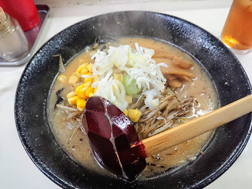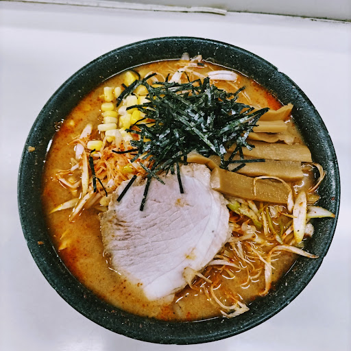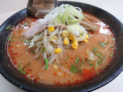 麺は毎日札幌から空輸される西山製麺の縮れ細麺。叉焼は確り仕上げで好感が持てる。味噌は白味噌ベース。その白味噌ベースのスープに唐辛子と豆板醤そして挽割り納豆が1パックの1/4投入されている。この納豆が程良いコクとまろやかさをだしている様で、とても美味しかった。なおお店の方からは『良く混ぜながら食べないと、唐辛子が底に沈んで後から地獄をみるよ!』とのこと。アドバイス通り良く混ぜて頂いたので激辛ではなかった。あとランチ時には先着?名様まで小さな俵型のお握りが付いてくるので、不用意に大盛(税込200円)にしない方が良いだろう。