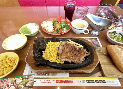 まずパンに付けて食べるのがおすすめです。パンにはバターがついてきますが、バターを塗るよりも数倍美味しくいただけます。 パンに使わなかったバターですが、熱々状態の鉄板プレートに全部入れたらサラダバーのスイートコーンをたっぷり入れて焼きます。焼きとうもろこし味のコーンバターが時短で完成です。フライドポテトにもバターがしみて一石二鳥。したがって肉に添付のソースはかけるのではなく、つけ汁のような使い方になります。