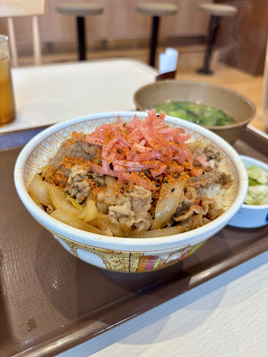 ゼンショーホールディングスが運営している牛丼のチェーン店です。全国展開している牛丼チェーンの中でもトッピングやランチ、デザートがあり、他のチェーン店とは差別化されています。木曜日の昼過ぎに訪れましたが店内は4割程埋まっていました。店内の席についてから店員にメニューを告げ、食べ終わったらバインダーを持って入口にある機械で支払うシステムです。テイクアウトの場合は専用の機械があるのでそれで注文します。牛丼屋だけあってどのメニューもリーズナブルで、味付けもスタンダードである程度のボリュームがあり、定期時間も早かったです。サービスや店内の雰囲気は他の店舗と変わりません。今回は昼時に訪れたのでランチメニューがあるのは良いと思いました。安く、早くお腹を一杯にしたい...