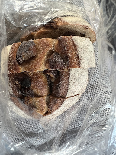 The melon bread is 110 yen but quite small. My favorite is the Noa Chocolat. It uses homemade raisin yeast and is filled with dried mango, fig, cranberry, walnut chocolate chips, and even chunk chocolate, making it almost a cake-like bread. They also offer half-size loaves and can cut them into pieces for you.