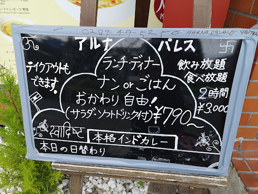 Read moreカレーが食べたくなり矢板のアルナパレスさんへ。金曜日の20時に訪問。先客1組、その後1組来店されてました。店内は広く席はいっぱいあるので安心。駐車場はお店前に置きましたが後ろにもあるのかな? チキンカレーとキーマカレーにチキンを注文。 カレーを一品頼むとサラダにナン、ドリンクが付いて来ます。 辛口が苦手な私がチキンカレー1で注文しましたがピリ辛ではありました。 でも食べられる辛さだったと思います。 サラダは安定のオレンジドレッシング! ドリンクはラッシーを注文。でも今まで飲んだラッシーの中では薄い感じがしました。甘さ控えめで酸味があるような。 カレーは美味しくいただきました! ナンはおかわり出来そうでしたが夜なのでやめて正解。 また機会があれば伺ってみ...