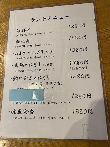 Read more何年か前に、知人とあわただしく夕食をいただきました。今回、近くで用事を済ませた折、思い出して老夫婦でランチを楽しみました。印象度は大幅アップ。二人で海鮮丼とにぎりランチを注文しました。漬けイカや肉巻きなどオリジナルな味わいも楽しめ、程よいボリューム感でした。チラシは注文時に「大盛りにしますか」と聞かれました。無料でシャリを増やしていただけるようです。カウンターには当地の地酒が並び、夜は居酒屋風のお店になるようです。店主は「夜もお食事だけのお客様もおいでなります」と話されました。カウンター、テーブル、小上がりと、こじんまりとしたつくりですが...