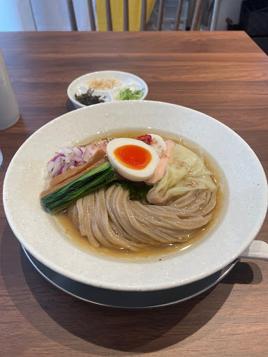 先日初訪問しました🔰 土曜日の昼過ぎに伺ったところ、4人ほど外で待っていました。 名前を書くものはなく、行列にそのまま並ぶスタイル。 タイミングよく駐車場が空いたので車を停めて列に並びました。晴雨兼用傘が置いてあるのは珍しいサービスですが何気に嬉しい。 15分ほど待って店舗内に案内されました。 限定麺は全て売り切れ。 定番メニューを食券機で購入して、店内の待合で約10分。席に案内されてから料理提供まで約15分。食べるまでに結構な時間を要しました。自家製麺だけあって麺は美味しかったです。