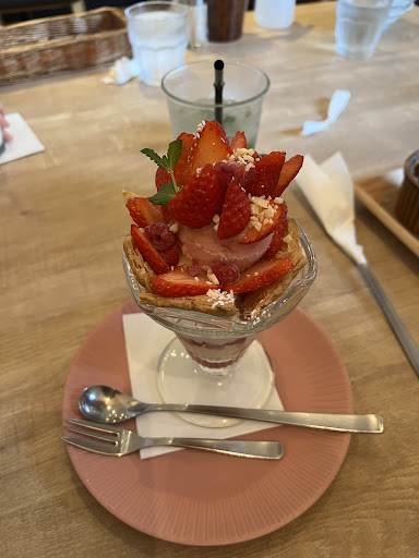 Read more日曜のお昼過ぎに伺いました。 「たっぷりイチゴの大きなパフェ」は1,200にもかかわらず、とても大きいとは言えないサイズでした。 スライスした苺が全体に乗っていて、周りには薄く焼いたパイ生地、その下は苺のアイスにバニラアイスとベリーソース。パイ生地以外は至って普通でした。なのに1,200円💧値段以下でした。