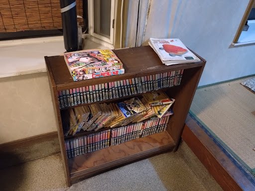 料理は写真撮り忘れたけど、すごい年季の入った本棚に色褪せた昔の漫画が並ぶ中、上に最新の少年ジャンプとサンデーが乗っかってるのがなんかツボだったのでパシャリ。