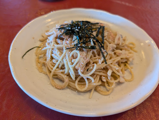 ペペロンチーノは、スープパスタ? ニンニクとオリーブオイルの香りはゼロに近くパスタは柔めの茹で加減。きっと豚肉とシメジは炒めたものが入っているのだろうけど、料理の1/3が浸かる汁がある為、台無し。期待したパスタではありませんでした。キノコの種類はシメジだけ。 ミートソースはボロネーゼ? パスタにミートソースが乗ってるタイプでは無く混ぜ込みスタイル。しかも水っぽい。隣席の客が注文していたボロネーゼと見た目はほぼ同じで温玉の有無の違いにしか見えなかったな。 全体的に湯切りが甘いのか、調理工程で炒めが無いのか、ちょっと残念でした。 ピザは薄生地のタイプで、生地の旨味や香ばしさは感じられませんでした。