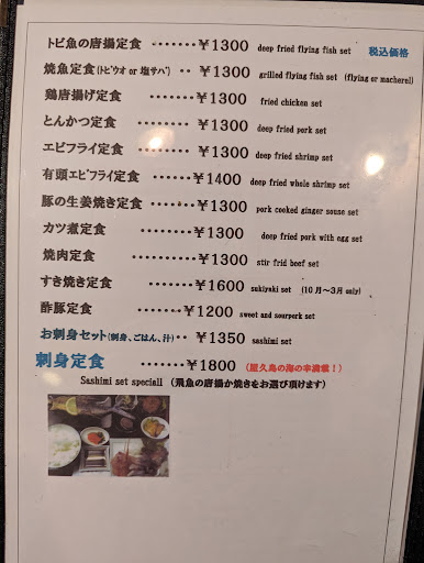 Very nice food, I didn't have such a good meal in times with delicious sashimi, grilled fly fish, Satsumaage, rice, miso, vegetables and some clamps. I took the ¥1800 sashimi special set and this is absolutely delicious. The portions are big, and if it's not enough, there is one free refill of rice available. The staff is very friendly and the place feels tidy and clean. I had a comfortable evening. I finished with a ¥50 cup of drip coffee. It's a shame I have to leave, because this place is worth...