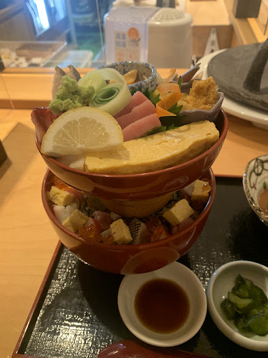 2段重ねになった海鮮丼が気になり、ランチに伺いました。 「海鮮丼 上」をいただきました。 海鮮丼 上は2段となった海鮮丼で、1段目は温泉卵をかけて食べる海鮮ちらし、2段目は、刺し身がいっぱいのった海鮮丼になっていました。 見た目は綺麗でインパクトがありました。 最初に2段目の海鮮丼からいただきました。 うに、いくら、かき、などものっていて海鮮が好きな自分として嬉しかったです。 マグロなども脂がのっていて甘みのある刺し身でした。 1段目の海鮮ちらしは、刺し身、だし巻き玉、いくらがのっていて、温泉卵もかけていただきましたが、卵の甘み、いくらの程よいしょっぱさなどがご飯とあっていて美味しかったです。 見た目も量も味も満足いく一品でした。