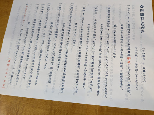 Read moreまたまた美味しいお店を発見!絶対お勧めイチオシです︎💕︎。 古民家をリノベーションされている、心休まる雰囲気のお店です。お店は少しわかりにくかったです。さすが隠れ家。お店の方の対応も良く気持ちよく、のんびりと食事することができました😊。 予約をしてからの1人ランチでしたが、「美味しー😋」と独り言が何度も出てしまいました。 数量限定のおむすび御膳(おしながき付)を注文し、1口1口味わいながら、ゆっくりと頂きました。 おむすびは山鹿産の新米なので、いつもは黒米を入れて炊いているそうですが、今日は白米でした。ふんわりとしていて最高の美味しいお米でした。具は特にピーマン味噌が美味しくてびっくり。お土産に買いたかったのですが、昨日売り切れてしまったそうで残念でした。 小鉢もどれもピカイチの優しいお味。丁寧に作られていました。 お味噌汁もこれまた最高でしたね😍👍💕。野菜を重ね蒸しして作られているそうですが、どうやって作っているんだろう。本当はどんぶりにいっぱい食べたくなったくらいです。 デザートは黒の冷えたプレートの上に乗っています。飲み物はアイスコーヒーチェリードリンクをチョイス。コーヒーの果皮と果肉を乾燥させた?カスカラで作った甘いシロップ?読んでもよく分かりません。それを炭酸で割ったものです。飲んでびっくり😳💗。味わったことのない美味しさ。美氣ドリンクは白米と紫芋で作られていて、上にチェリージャムがのっています。あんまりに美味しかったのでお土産に買いました。 栗の季節なので栗のスイーツでしたが栗の味がしっかりしていました。 ブリュレも美味しくてお聞きしたところ、近くにある「ばおばぶ」さんが作ったということでした。ばおばぶさんは山鹿の和栗スイーツフェアのパンフレットに載っていてリサーチをしていた私は、栗パイを買いに行こうと思っていたので偶然でした。早速帰りに寄って、ブリュレ、栗パイと、あたたかい木さんのお勧めの栗あんぱんを購入しましたよ。 そして最初に出てきたお茶が初めてのお茶でした。ほうじ茶に紫蘇とレモングラスが入っていました。山鹿の水が美味しいのか、まろやかで美味🤤𓂃𓈒𓏸︎︎︎︎。おかわりは自由にサーバーから頂けます。 無農薬野菜や珈琲なども少しですが販売されていました。 あと、ここでお料理に使われているお水は阿蘇の白川にある「天旺水」で、わざわざ汲みに行かれているそうです。汚染されていないシリカを含む豊富なミネラルたっぷりのお水で、定期的に検査もされてるとのことで私も是非行ってみようと思います。素晴らしい情報をゲットでしました! 私は開店と同時におじゃましましたが、次々と予約された方が来られました。帰りに見たらランチ完売の看板が。平日でも予約は必須です。 幸せいっぱい口に広がった日でした...