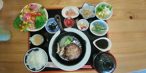 シンプルでおしゃれな内外観もよきです。 開店後まもなくだったので、1日2食限定の赤牛の手捏ねハンバーグをいただきましたが、見た目から美味しそうな感じが伝わり、味も大満足。 牛肉の旨味をしっかり感じられ、野菜も大好きなので、野菜たくさんあって、大満足です。 食いしん坊さんには、ごはんを大盛りにしたりおかわりしたら良いかもです。 デザートも食後のコー...