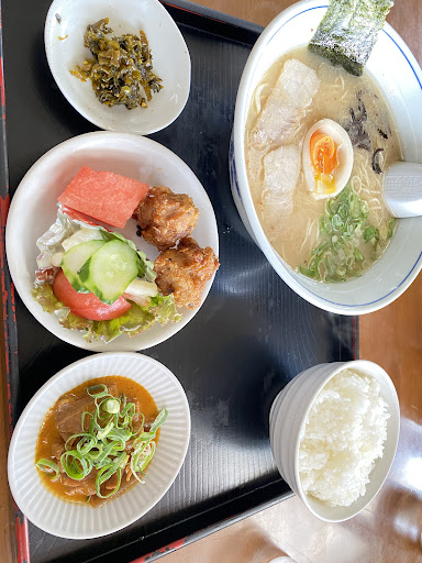 Read more開店10分前に駐車場に到着したところ、5分前に店内に入れてくださって恐縮しました。 ちゃんぽん、炙りチャーシュー麺の半チャーハンセットを注文 ・ちゃんぽん:野菜の旨味、甘みがしっかりと出たとてもまろやかでおいしいスープ、具材も豊富でオーソドックスなものに加えて唐揚げ、練り物などが入っていました。ウインナーには笑いましたが。 ・炙りチャーシュー麺:豚骨100%なのに臭みがなくむしろあっさりしています。細めの麺との相性は抜群のとても美味しいラーメンです。そしてお店自慢の炙りチャーシューは表裏ともしっかり炙られた(むしろ焼かれたようにも感じましたが)もので、柔らかく溶ける食感と反対の歯ごたえのあるものでした。しっかり焼いているため薄い部位が固くなっていたのはしょうがないでしょう。 ・チャーハン:半チャーハンでもボリュームは結構あります。特徴はレタスと炙りチャーシューを使っていることだそうです。よくある中華のチャーハンと違うものですがシンプルに美味かったです。