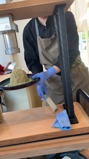 日曜日の午後、たまたま 通りがかりまして、何の 知識無く寄ってみました。 外観は木材を沢山使った やわらかい雰囲気の中に 老舗店の風格もあります。 まだ4月オープンとの事 店内にはお祝いの胡蝶蘭 などもあり初々しさ満点。 手動引き戸を開け入ると 右がお菓子の物販サイト 焼き菓子や創作和菓子等 綺麗に並んでいます。 左側がカフェコーナーで ベージュ系色の色使いや 広い窓から外光も取入れ やわらかいく落着きます。 こちらは、席で注文する システムで混んでる時は 名簿に名前と人数を書き 待ちます。 もう、早々と名物らしい 〈生リップルパイ〉など 品切れ告知が入口にあり 席にてスタッフが実演を してくれる〈絞りたてモ ンブラン〉とコーヒーを 注文いたしました。 最初にコーヒーが出され ました。ブレンドですが 濃いめではなく女性でも 飲みやすいかと思います。 席には砂糖ミルクは無く 提供時必要か聞かれます。 スティックのシュガーと パックのフレッシュです。 その後、コロコロ器械を ひいてスタッフが登場し 生モンブランの実演開始。 餡や細さの説明をしつつ かき氷を作る様に綺麗に デコレーションします。 仕上に粉砂糖とクッキー 沿えて終了になります。 動画撮影を頼みましたが 快く受けて下さいました。 中心にメレンゲクッキー ホイップクリームがあり 生モンブランの餡です。 お味は、栗餡がマッタリ メレンゲクッキーは口の 中でとけてしまう感じ。 大変美味しいです。 大きさは、二人シェアが ちょうどくらいです。 老舗菓子店の斬新な発想 なかなか良いですね。 席では、オシボリと水が 出されますが、ペーパー ナプキンが卓上にあ...