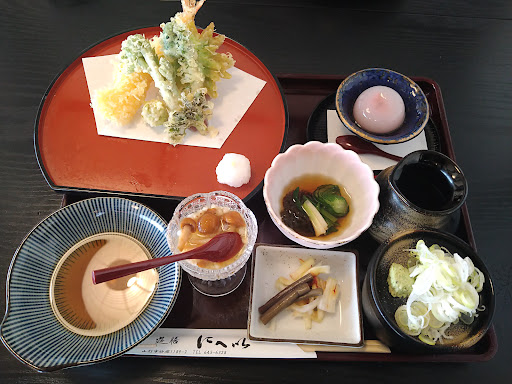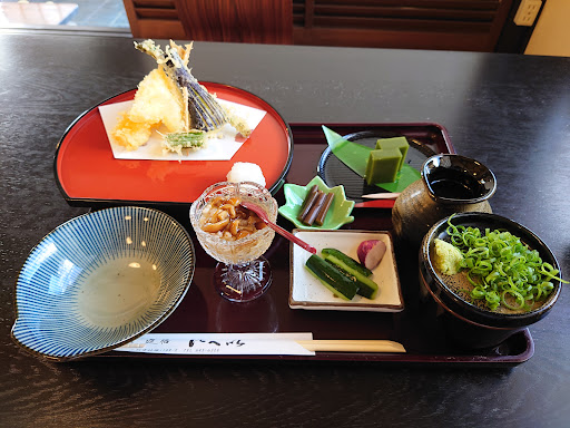 Read more料亭風のお蕎麦屋さん 天ザルが有名だったので寄ってみました メニューが少ないけど、一つ一つが豪華です しつらえも和風モダンな感じで花が生けてあり、風雅なお店です 天ザルMでお願いしました 手打ちのお蕎麦も美味しかったです〜いい色の蕎麦でした 天ぷらは季節ごと変わるそうです 蕎麦の実や季節の山菜がとても美味しくて、デザートでしっかり締めました 御膳で来るけ...