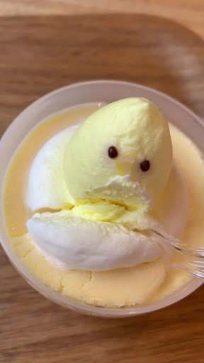 お店の外観や内装もですが、たまご🥚やひよこをモチーフにしたモニュメントが多く、とってもかわいらしいのです♡ 「たまごの国」というだけあって、たまご感が出てますね👍 外の卵🥚の形のモニュメントの中に人が入る事もでき、小さい椅子や小さいテーブルまであります。それがとても可愛いのです😍