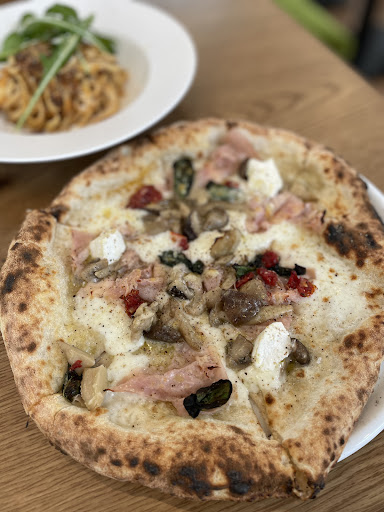Read more初めての来店です。七日町にあるフラム🍕の話題の新店舗です✨ 駐車場には次々と車が訪れ、店内もたくさんのお客さんで賑わっていました😊 外からピザ窯が見える入り口を入ると、吹き抜けの明るい店内にガーリックとチーズの焼けるいい香り。1階の入口付近にはイタリアンワインやチーズ、パスタや生ハム、即イタリアンを楽しめるソースなどがたくさん販売されていて、見るだけでも楽しい🎵 2階の席に通されると、こちらもたくさんのお客さん! メニューも様々。ピザがメインですが、パスタやリゾット、サイドメニューもたくさん! 今回はピザセットとパスタセット、それぞれを頼みました。 県内のものを多く使い、手作りにこだわっている様子。パスタのボロネーゼはゴロゴロしたお肉と食べごたえの平打パスタがよく絡み、絶品でした❤ そして、このヒザがまた格別✨ エビや黒ほうれん草の乗ったこのビザ、生地だけでも絶対美味い!と確証が持てるこの味、このモチモチ。全部食べられるかな。。と躊躇した自分を責めたくなるくらいあっという間にぺろりと食べられました!