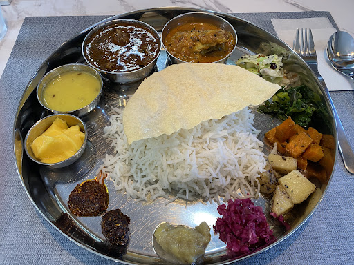 お店のメインメニューはミールス形式の南インド料理です。タール皿にアチャール(副菜)とパパドとライスが乗り、カリーがカトリに乗ってくる、王道のミールス形式。