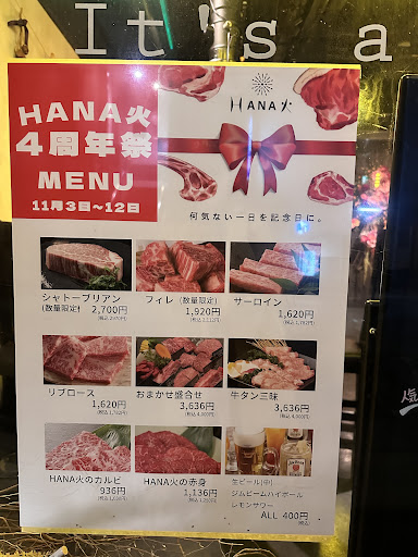 Read moreクレームです。こんなクレームを書くのは初めてです。 世界で1番好きな焼肉屋さんです。 もう本当に、非の打ち所がないくらい全てが素晴らしすぎて、世の中に存在する全ての褒め言葉をかき集めても正しく伝え切ることができないくて、悔しいです。嘘偽りなく最高なんです。 去年の2月末、娘を妊娠中おおつわりの最中産前最後の旅行で長野から車で山形に遊びに行きました。 完全に夫婦共々浮かれており、夜ご飯のことなど、なーんにもノープランでいき、見事にほとんどのお店が閉まる時間が早く、そして予約でいっぱいの状況で、途方にくれておりました。そんな中藁にもすがる思いでHANA火さんにお電話したところ言われた一言がまずこれです。 『すみません、お足元が悪い中ご足労いただいて、少し店内でお待ちしていただいてしまうかもしれませんが、宜しいでしょうか?申し訳ございません。』 です。 え?え?私たちが、考えなしに、 『どこか空いてるっしょ!★』となめくさってきて途方に暮れているところ、待つのなんて当OF然なのに、なんてお優しいお言葉…この時点で私はちょっと感動して泣いています。