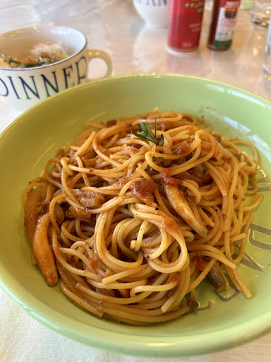 冷凍麺にレトルトだと思われるトマトソース、しめじ、玉ねぎを足して枯れたローズマリーが添えてありました