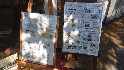 アーチトレリスをくぐって入る店内は広々としていて、各種ハーブも販売している。広めにレイアウトしたテーブル席、明るく開放的な空間で多くの自然を感じつつ快適である。