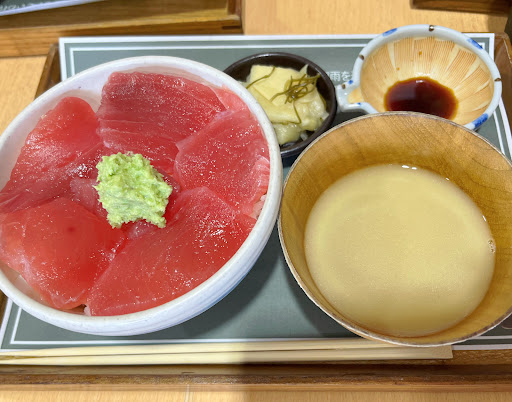 ちょうど、ランチ時だったので、こちらでランチをすることにしました。 お店の前でメニューを見て迷いながらも キハダ赤身丼にしました。 メニューは、オムハヤシ、飛騨牛ステーキ、天丼、海鮮丼、ラーメン、蕎麦、うどん、などなど、他にもたくさんのメニューがあり、お値打ちにいただけます。 お子様のメニューも少しあります。