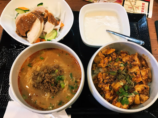 Read moreオープン初日に伺いました。「欲張り4点セット」で棒棒鶏、担々麺、麻婆丼、杏仁豆腐を選択。店員5人で店をまわしているようですが、開店初日ということもあり慌ただしさがありました。 【棒棒鶏】 鶏肉はしっとり柔らかで美味しかったです。ただ、写真では野菜が全て細切りされているように見えるのですが、実際は人参が半月やいちょう切り、きゅうりも半月切りで、野菜ごとに切り方がバラバラで食感があまり良くないかなと感じました。惜しい。 【担々麺】 スープが薄くてぼんやりとした味。 【麻婆丼】 山椒が効いてて美味しいです。餡は少なめですが、辛さで硬めに炊かれたご飯がよく進みます。 【杏仁豆腐】 トロトロなめらかな本格的な杏仁豆腐。牛乳寒天ではありません!濃厚ですごく美味しい。辛いものの後だとより甘さが際立ちます。かなり好きです。これのためにまた行きたいと思います。